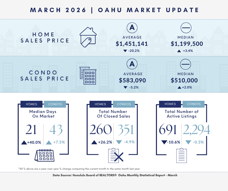 Buyer activity was slightly down in March, which may reflect a combination of factors, including higher mortgage rates and recent weather-related impacts from the recent Kona low systems. Both markets saw fewer contract signings, with pending sales in the single-family home market falling7.5% year-over-year to 245 and condos pending sales declining 6.2% to 394.
