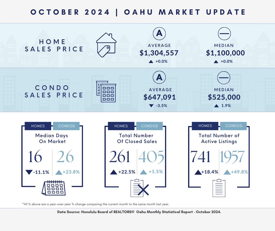 Year-over-year the median price for single-family homes remained unchanged at $1,100,000, while condos saw a 1.9% increase to $525,000. Compared to October 2023, median days on market remained steady, with single-family homes at 16 days, down from 18, and condos at 26 days, up from 21.