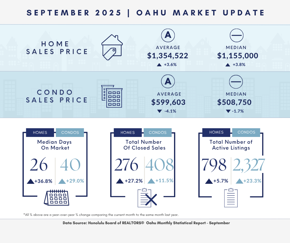 September of 2025 ended with rising sales for Oʻahu’s housing market. Single-family home sales jumped 27.2% year-over-year in September, to 276 sales, and 6.1% for the quarter. Condominium sales increased 11.5% to 408 last month and were up 2.8% compared to the third quarter of 2024.